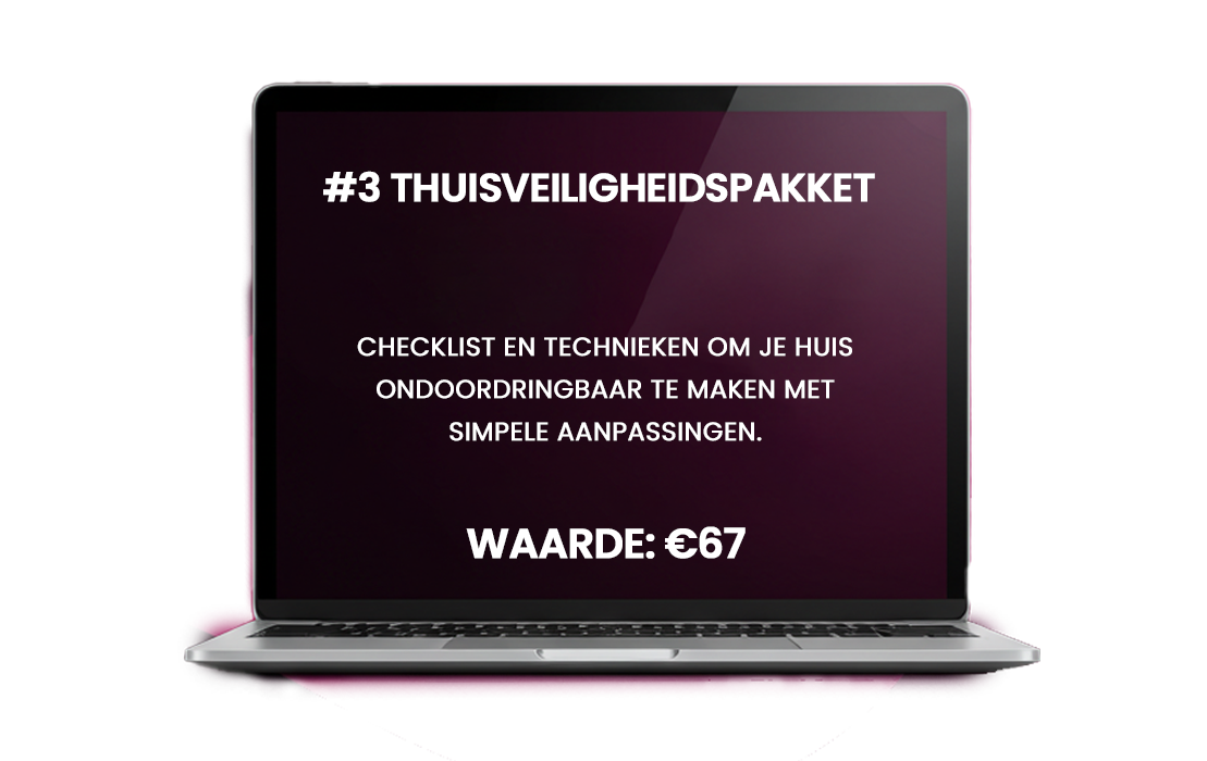 Je krijgt de complete 1-avond training met alle beschermingstechnieken, plus digitale werkboek, thuisveiligheid checklist, reisbescherming strategieën en exclusieve bonussen ter waarde van €891.